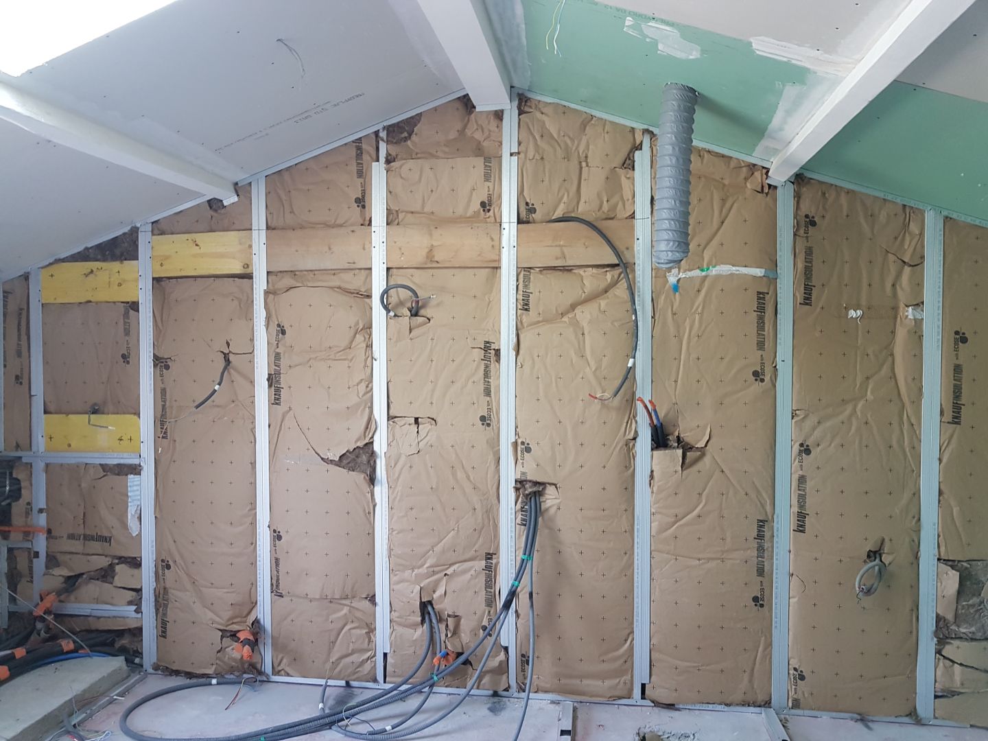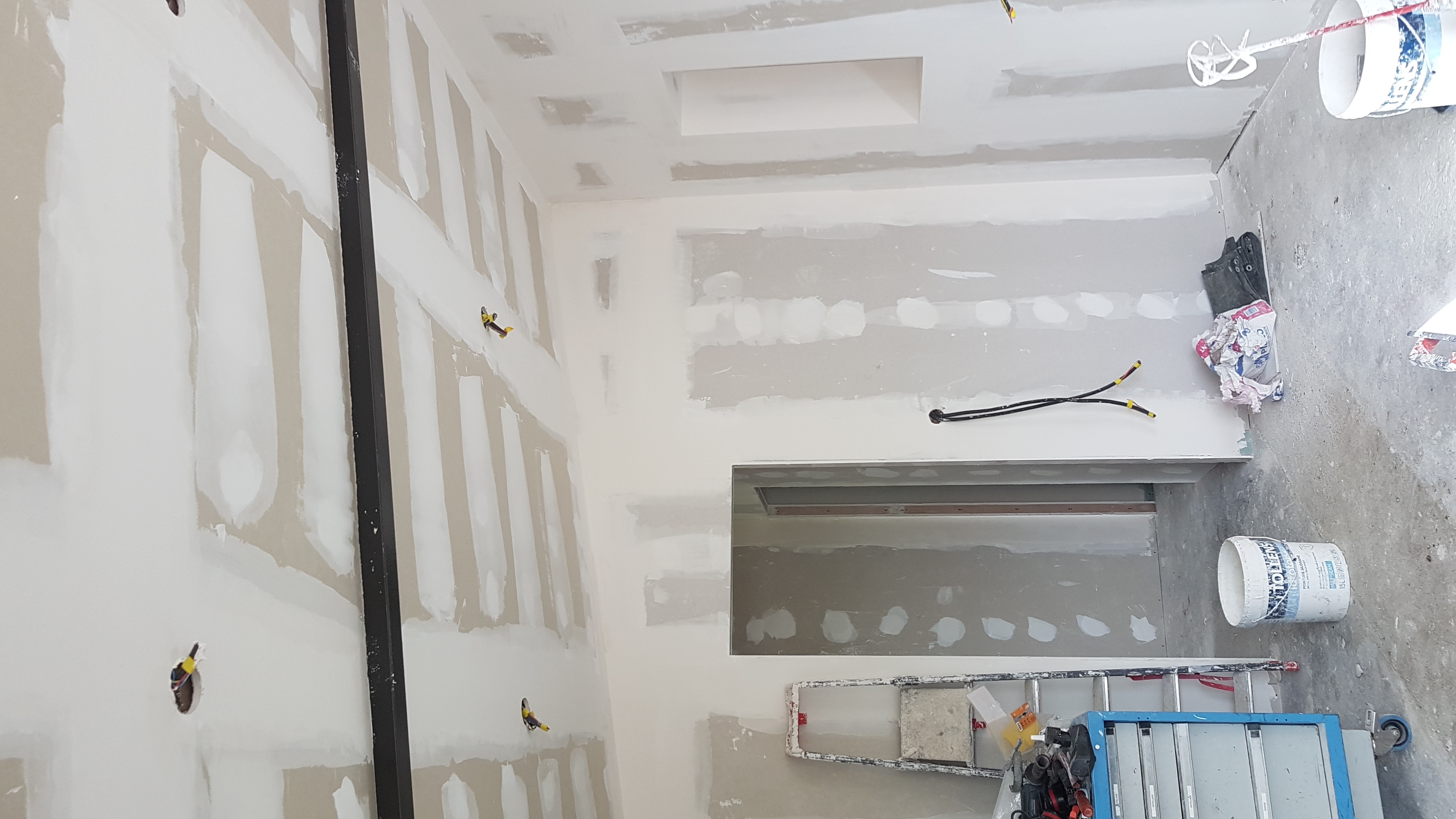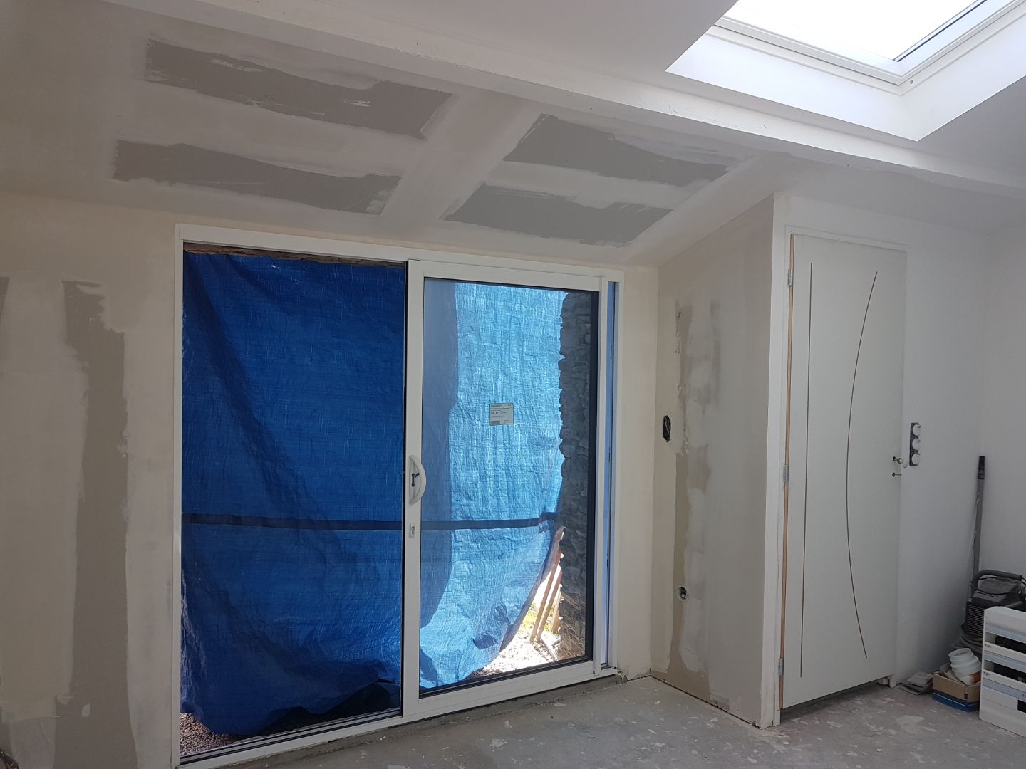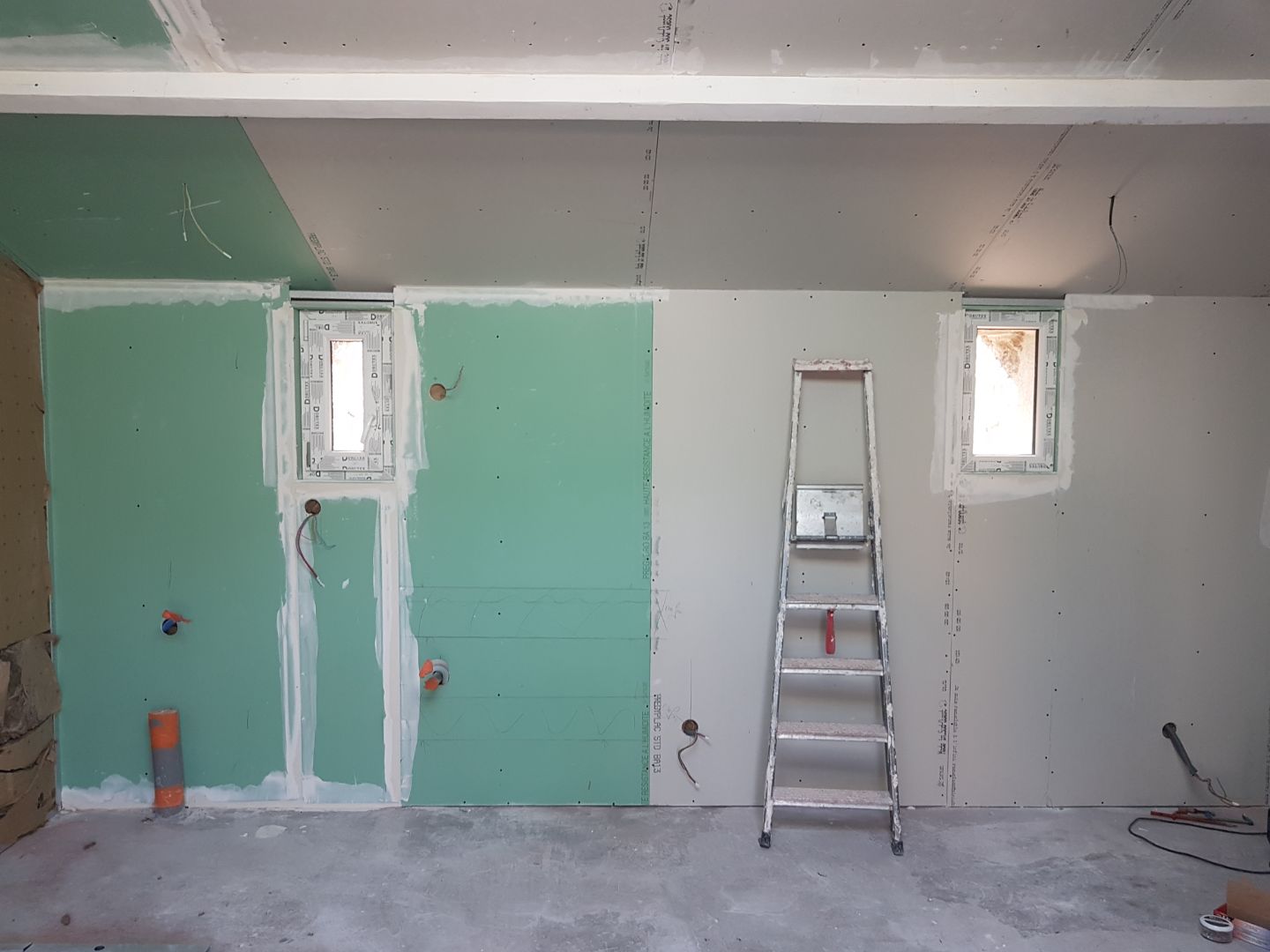 - Pose de doublages en plaques de plâtre avec mise en place des bandes, collage et finitions
